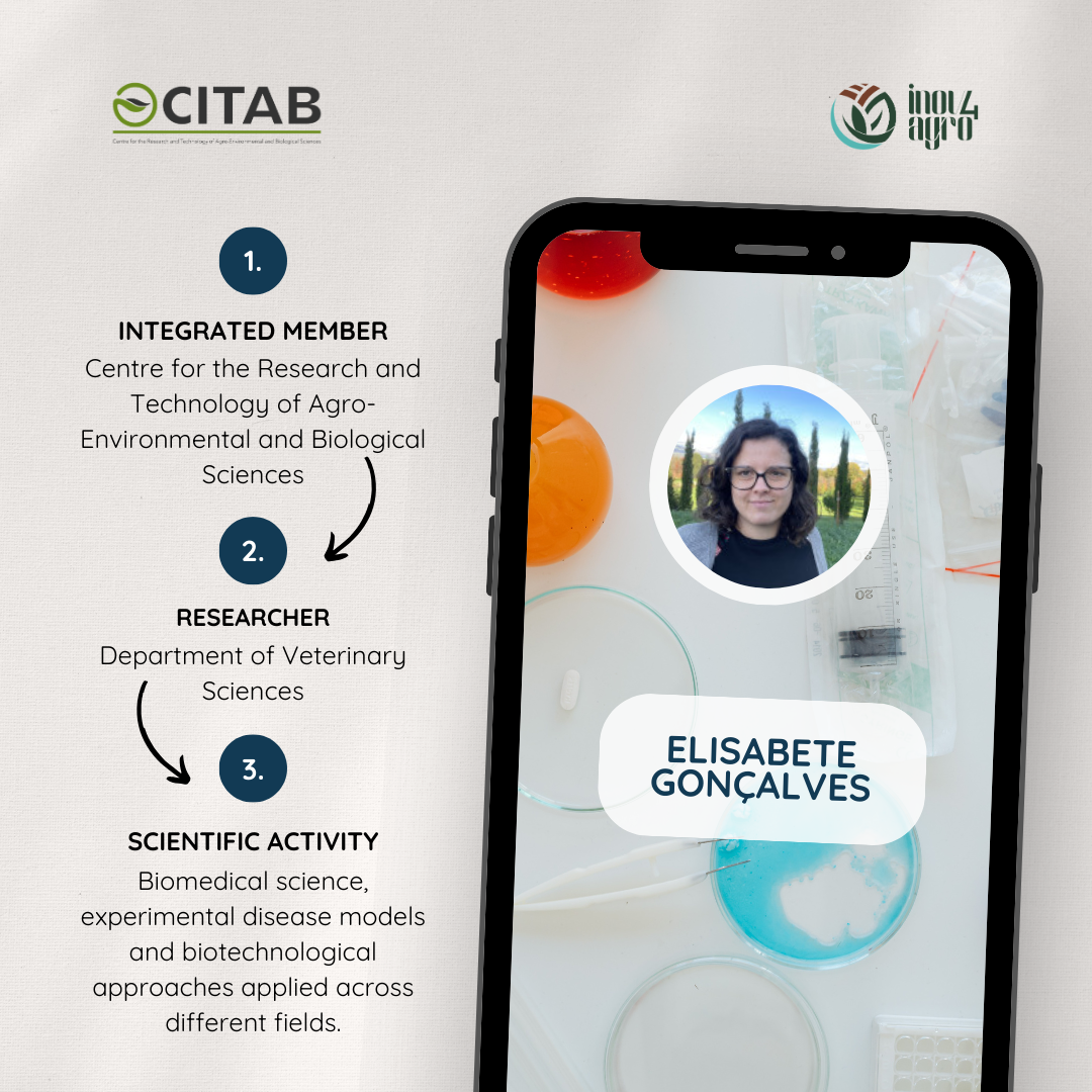 Elisabete Nascimento Gonçalves is an integrated member of CITAB, where she develops multidisciplinary research that combines biomedical science, experimental disease models and biotechnological approaches applied across different fields. She holds a degree in Biomedical Engineering and a PhD in Veterinary Sciences, with a specialization in Biomedical Sciences from UTAD, and has built a solid track record in preclinical research. With 24 scientific articles published and more than 70 conference communications, she has also contributed to student supervision, scientific outreach, and participation in several funded projects. She is currently a research fellow in a subproject of the Vine & Wine Portugal Mobilizing Agenda, funded by the Recovery and Resilience Plan, entitled BFF_Bioprocessed Fertilizers, where she applies her biological and experimental expertise to the study of eco-friendly fertilizers produced through composting and vermicomposting.