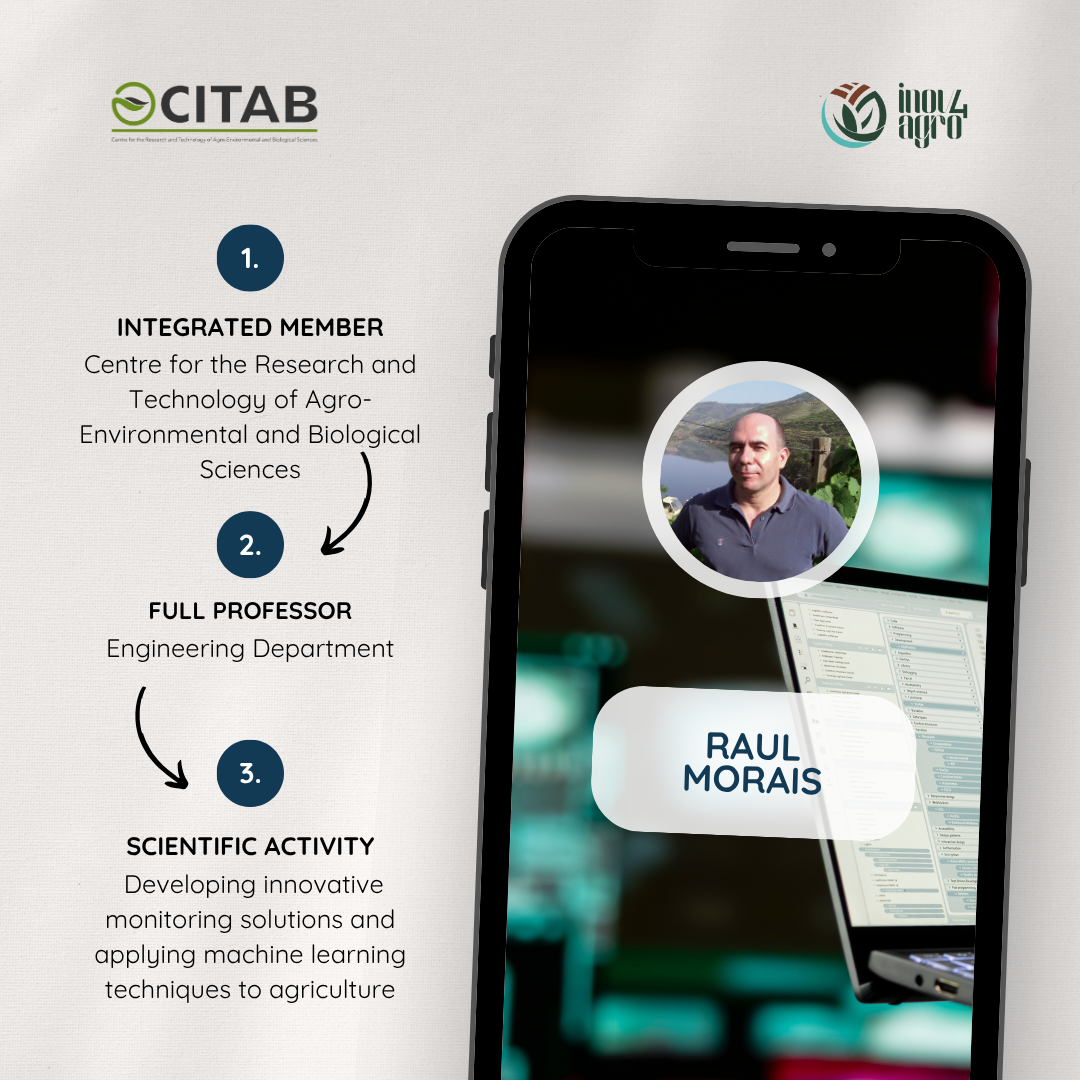 In the scientific field, Raul Morais is a researcher at CITAB, where he coordinates the thematic line ‘Technology & Innovation in Agri-food and Forestry Chains for a More Competitive Bioeconomy’. His work focuses on the development of electronic devices for collecting sensor data, with a special emphasis on precision viticulture. These systems feed digital decision support platforms, enabling more sustainable and intelligent agricultural management.