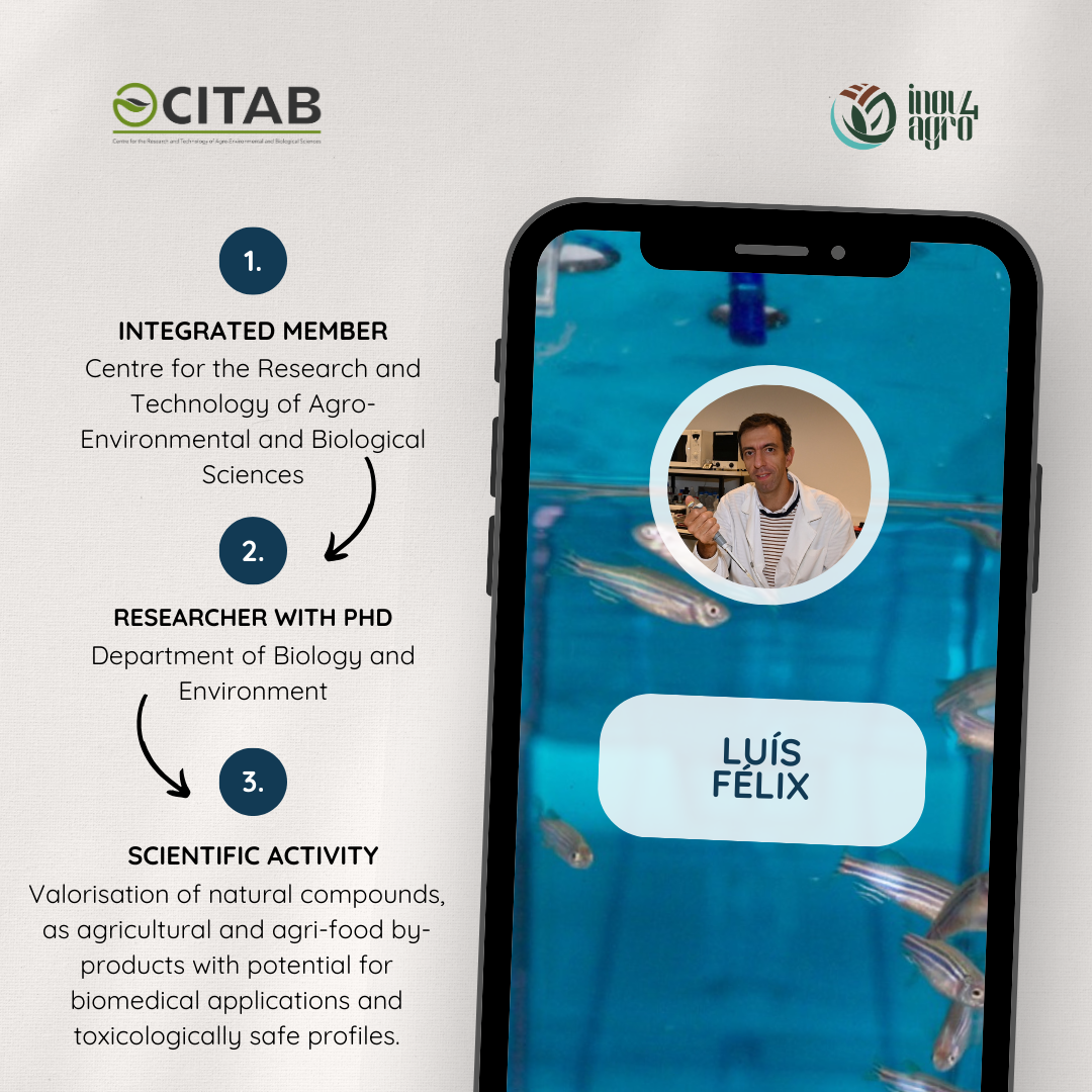 My scientific activity has focused on the valorisation of natural compounds, with particular emphasis on monoterpenes as agricultural and agri-food by-products with potential for biomedical applications and toxicologically safe profiles. The work developed has explored in depth the application of these compounds using biological models such as the zebrafish (Danio rerio). Through this model system, I have investigated the biological effects of these compounds, contributing to the understanding of the cellular, biochemical, and physiological mechanisms underlying their bioactivity. This approach not only enables the identification of robust biological profiles but also expands knowledge on the therapeutic potential and biofunctional properties of this class of natural compounds, aligning the research with the sustainability and innovation goals promoted by CITAB.