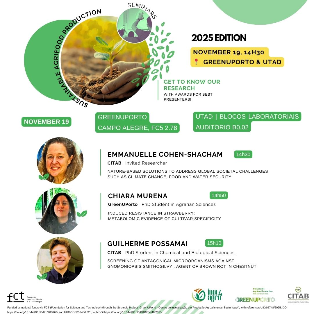 This session will feature the usual two presentations by PhD students from GreenUPorto (U.Porto) and CITAB (UTAD), members of the Inov4Agro Associated Laboratory, as well as a talk by an Inov4Agro Guest Researcher and, in this edition, CITAB will invite a collaborating researcher.