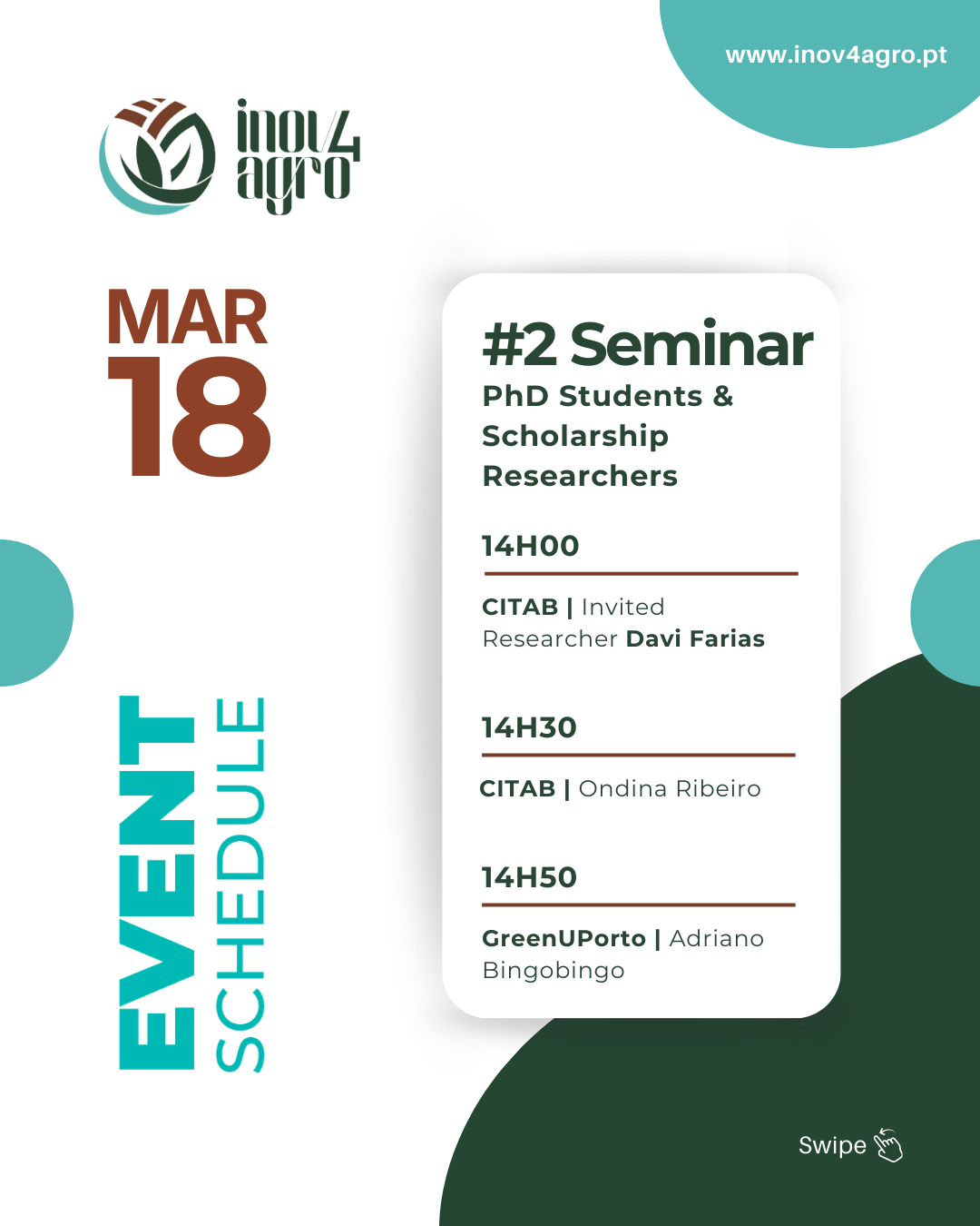 π As usual, each session will be opened by a Guest Researcher from Inov4Agro, followed by presentations from two PhD students and/or Scholarship Researchers from CITAB and GreenUPorto (swipe to meet them).